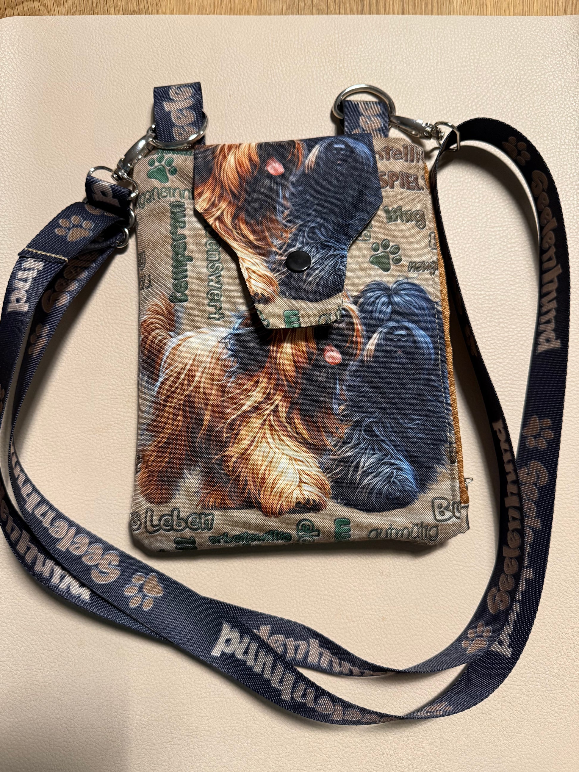 Farbe: Beige mit mehrfarbigen Briard-Motiven und grünen/braunen Textdetails